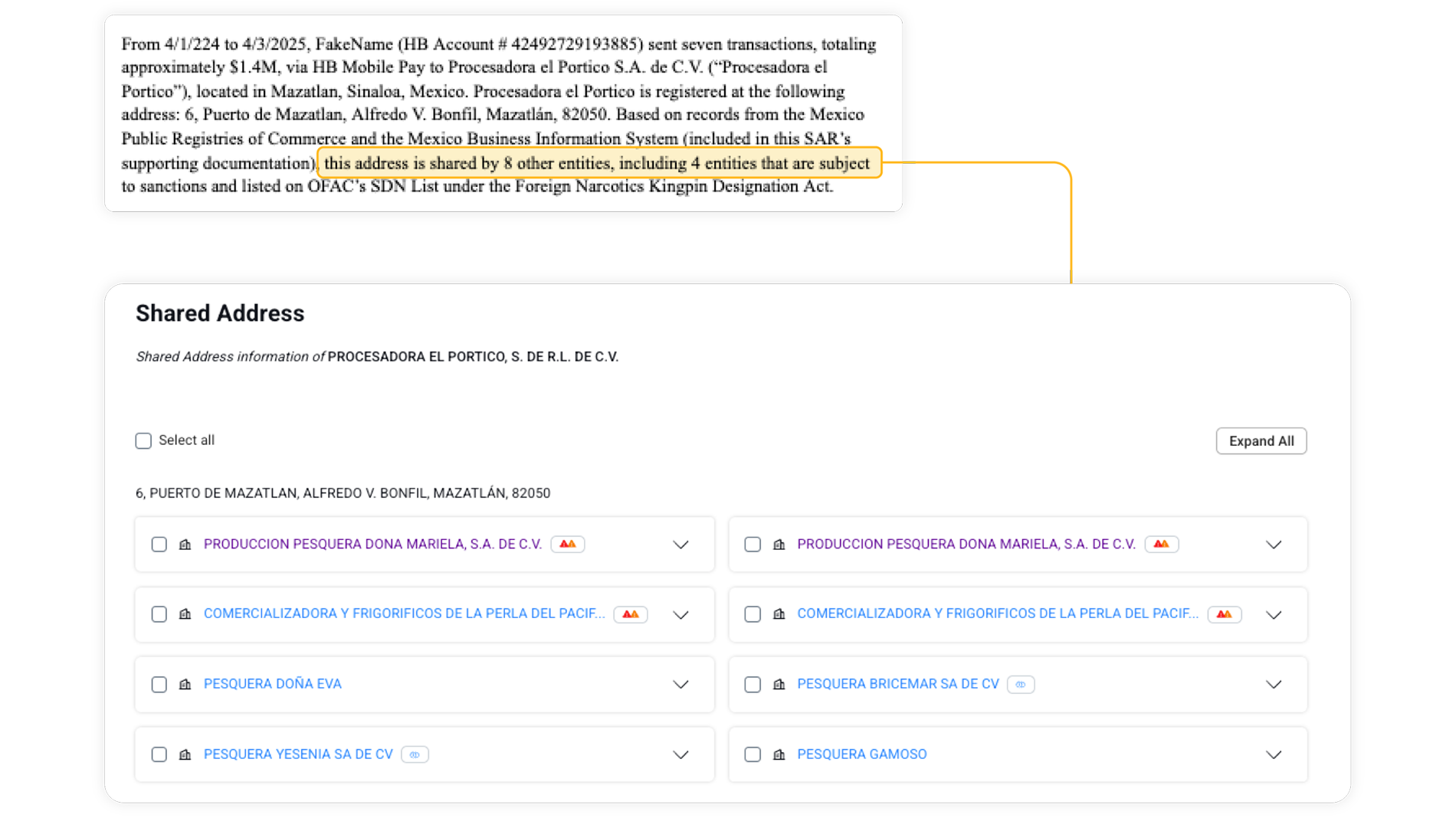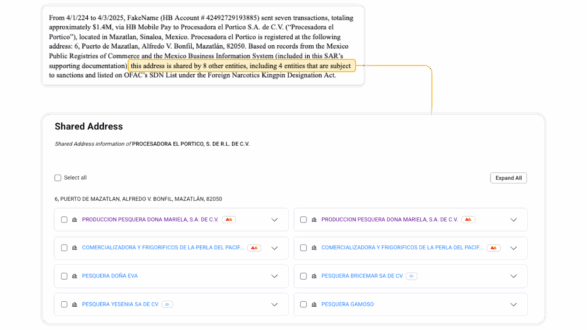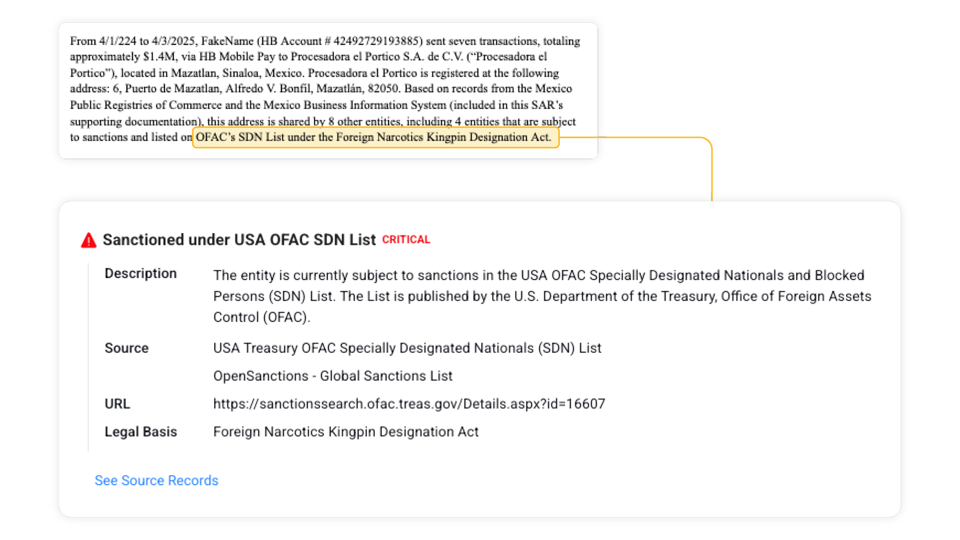 - Higher Quality Leads: The inclusion of verifiable public records, counterparty mapping, and other contextual data transforms a SAR from a standard alert into a credible and well-developed lead. This increases the likelihood of a successful follow-up investigation.