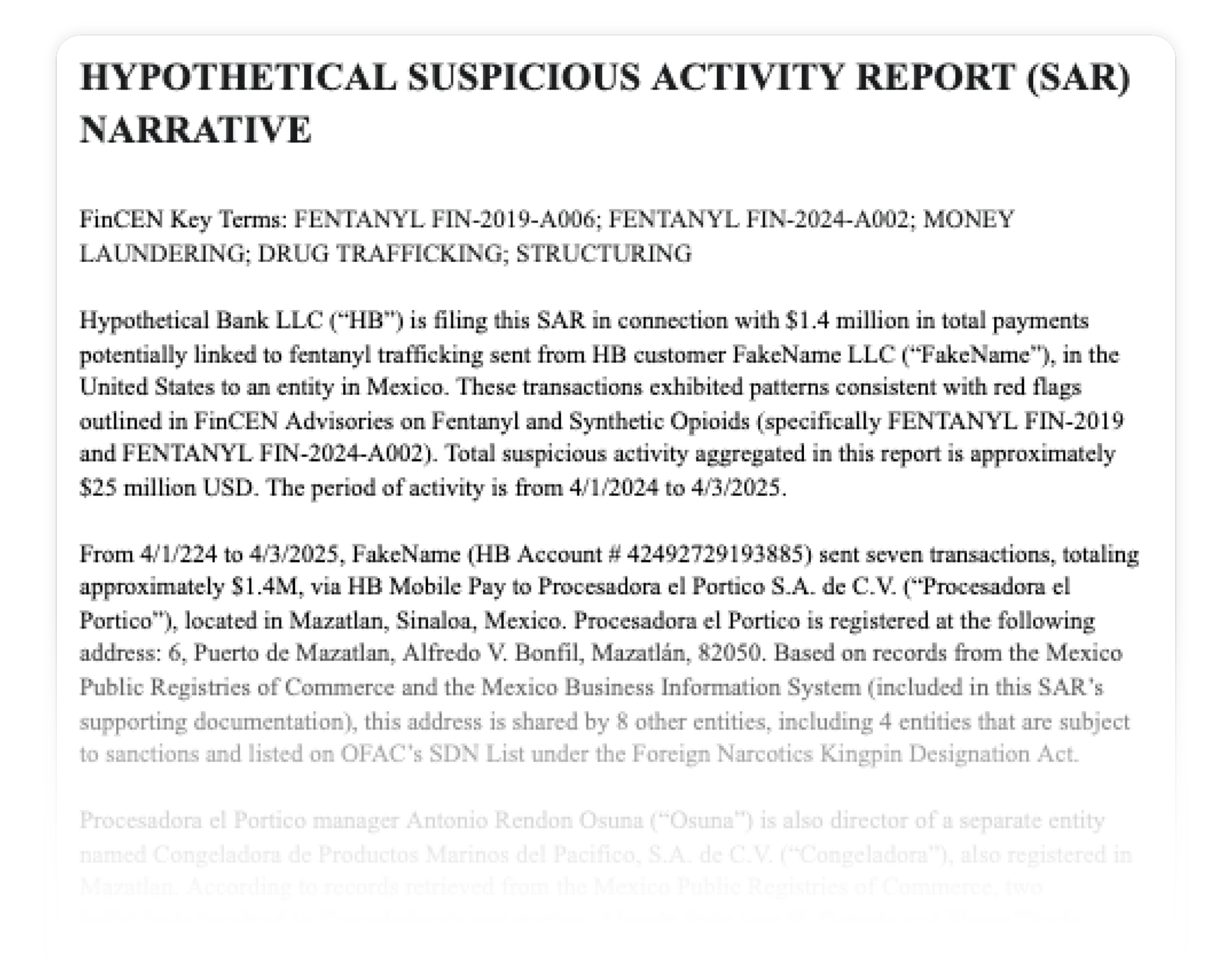 - Actionable Intelligence: Providing investigators with a complete and well-supported narrative saves them valuable time and resources. Rather than having to piece together fragmented data, they can immediately prioritize and act on the report.